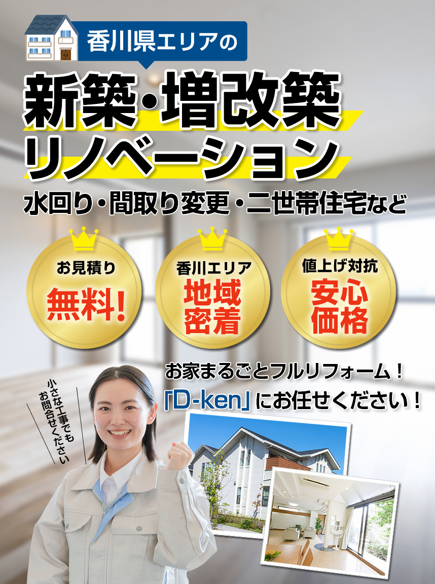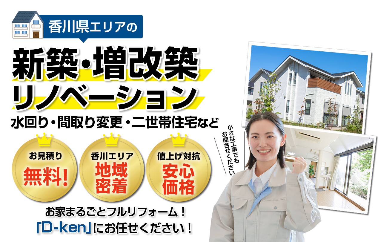 香川県エリアの全域で新築・増改築・リノベーションなどお住まいに関しては株式会社D-ken にお任せください。新築から建具の調節や手すりの取り付けといった小さなご依頼まで幅広く対応可能です。ハウスメーカー様でお断りをされた内容も柔軟に対応しますので、まずは一度ご相談ください!